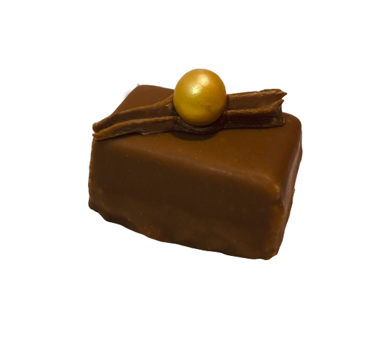 Bonbon met een crunchy karamel ganache vulling, gedompeld in melkchocolade met daarop een gouden parel. En voor degenen die er niet genoeg van krijgen; deze bonbon is ook verkrijgbaar als bonbontaartje!